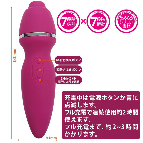 多彩なバリエーションを楽しめる7段階吸引×7段階振動を搭載!USBでの充電約2〜3時間で約2時間使用可能(使用状況、環境により時間が変化する場合がございます)。