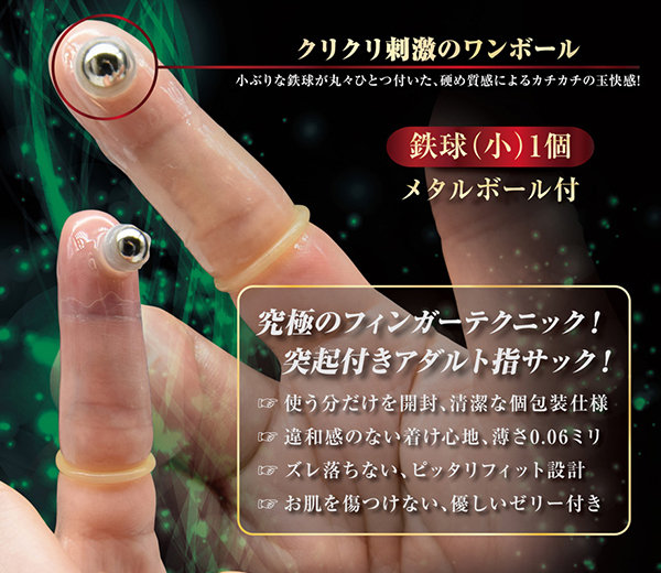 コリコリとした刺激が味わえるメタルボールが指先についたラブグッズ版の指サック!コリコリ、トントンとこれまでの指挿入では味わえない刺激が楽しめるほか、Gスポットやアナルに挿入して前立腺を刺激するなど男女兼用でお楽しみ頂けます♪鉄球はしっかり台座に固定されているので簡単に外れるような心配は不要!使うことで心地良い異物感が味わえるので細めのローターやディルドに被せて使うのも◎。